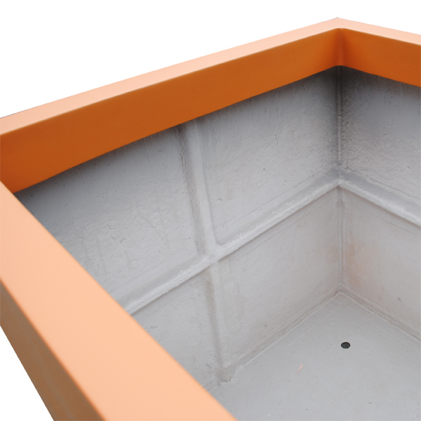 La paroi de ce très grand bac à plantes est opaque et lisse. Son matériau composite (résine polyester, fibre de verre et poudre de pierre) apporte aujourd’hui toutes les qualités matérielles qui manquent aux pots en grès ou en argile : légèreté et robustesse (très résistant aux chocs), ne craint pas le gel. Ces bacs peuvent rester toute l'année à l'extérieur même durant les hivers les plus rigoureux, son matériau est très résistant aux variations de température. En été, l'intensité des UV n'altère pas sa surface. Nous avons appliqué en couche de finition une peinture polyuréthane bi-composant (peinture et durcisseur) de qualité industrielle garantissant dans le temps une tenue de sa couleur. Il est aussi très différent des pots en polypropylène (plastique) matériau qui est fragile (cassant) à basse température.